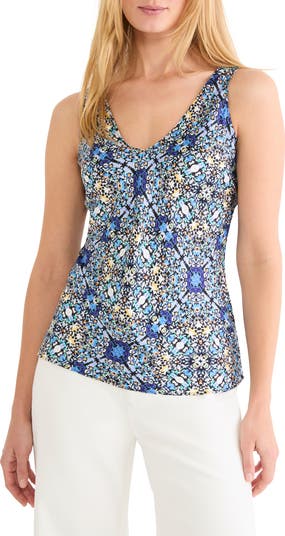 An intricate tile pattern makes a bold statement on a woven tank top fashioned with a classic scoop neck.