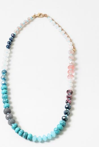 Made with resin beads and tiny seed beads, this necklace combines Erin's favorite colors to create a color palette that is absolutely perfect for every season. The bright pops of turquoise resin beads balance the calmness of the strawberry quartz and creamy indigo. We also love the variation of sizes of beads.