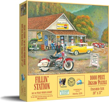 Immerse yourself in a bygone era with the classic Americana imagery of the Fillin' Station 1000 Piece Jigsaw Puzzle by SunsOut. Brought to life by renowned artist Peggy Myrick Knight, the nostalgic scene depicted offers captivating vibrant colors and historical charm. Each puzzle is crafted with interlocking pieces from recycled cardboard and printed with soy-based inks, ensuring snug and seamless assembly. The quality and durability of these made-in-the-USA puzzles provide a worry-free experience, even with repeated use. Eco-friendly and environmentally responsible, SunsOut puzzles reflect a commitment to sustainability while supporting a woman-owned small business in the process. Once assembled, the puzzle measures 20" x 27", creating a stunning display that's perfect for any puzzle enthusiast. The large full-color box adds an eye-catching touch, making the puzzle not only an enjoyable activity, but a treasured keepsake too. This Fillin' Station puzzle perfectly melds art, culture, and craft to offer hours of satisfaction and entertainment, making it an excellent gift for puzzle lovers or adults seeking laid-back pastimes. Embrace this enchanting piece of Americana and bring it home today!