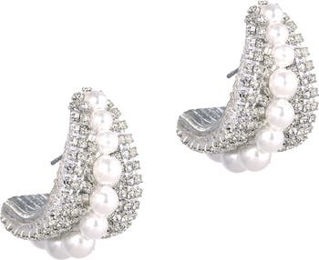 Lightweight materials elegantly mimic sparkling stones and gleaming metal on these statement huggie hoops centered by graduated faux pearls and backed by velvety suede.