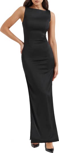 Thigh-high side slits are the focal points of this fitted matte-jersey gown with a chic bateau neckline.