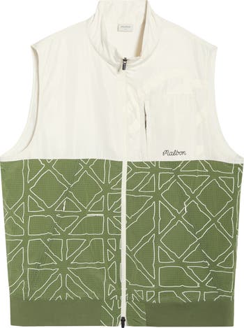 This hybrid vest featuring a sugarcane stalk print from the brand's spring '26 line features a wind-blocking collar and a trio of handy pockets.