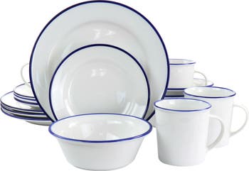 Bring the whole family together and serve up all your favorite meals with the Martha Stewart Fine Ceramic 16 piece Dinnerware Set in White. Your guests will love the dining experience. Set the mood the beautifully crafted ceramic material. These are set in white with blue edges bringing a very beautiful look to your dining table. The set will include dinner plates, salad plates, cereal bowls, and mugs. Add this to your kitchen collection. Item Dimensions: 11.00" x 11.00" x 10.75" Item Weight: 18.00lbs