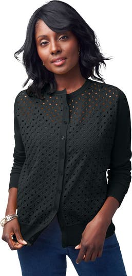 With its classic crew neck and long sleeves, this chic cardigan is a perfect layer to dress up or down all year long. Features delicate woven eyelet details on the front panel.