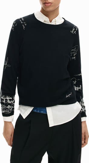 Saddle sleeves are decorated with artfully scribbled thoughts to frame this fine-gauge crewneck sweater.