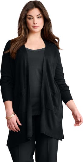 This open-front cardigan features a classic jersey stitch with linked set-in long sleeves and ribbed cuffs, offering a relaxed fit and comfortable warmth. Designed with patch pockets and side slits, it’s a versatile piece perfect for layering with any outfit.