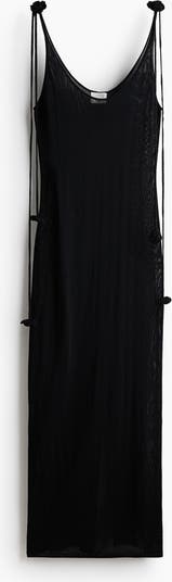 Long, fitted dress in a soft, fine knit made from a mulberry silk and viscose blend. Features a scoop neckline at the front and back and narrow shoulder straps adorned with flower-shaped, knitted appliqués and decorative ties at the top. Straight hem with a high slit at the back.