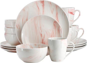 Bring the sophisticated look of marble into your home with the Elama Fine Marble 16 Piece Porcelain Dinnerware Set in Red. Every plate in this collection is decorated in a fine marble pattern and coated in a glaze finish for a sleek and shiny look. This dish set is crafted from quality Porcelain, making it both microwave and dishwasher safe for easy cleaning and everyday use. Tableware set comes with a full service for four, making this the perfect addition to your dining room table for family gatherings or dinner parties.