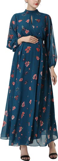Trendy and versatile, a floral maxi that can take you from day to night and from casual to formal. Whether your itinerary includes a day full of business meeting or casually galavanting around the town, this flowy, maxi is ready to take you anywhere. Smocked waistline for a customized fit. Cold-shoulder bishop sleeves complement a surplice neckline topped with a banded collar.