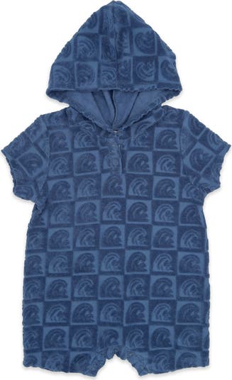 Patterned cotton terry cloth makes a beach-day favorite of this romper that's sized for baby and fitted with a soft hood for extra coverage.
