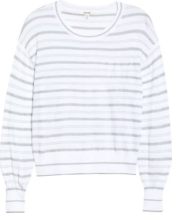 Understated stripes bring easy charm to this lightweight knit sweater designed for all-season wear. Dropped shoulders enhance the relaxed fit, while ribbed cuffs provide a classic finish.