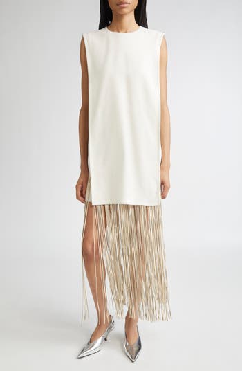 A study in contrasts, this cotton-viscose cady dress pairs sharp, clean lines with the playful drama of detachable fringes. Overlay panels frame the sleeveless silhouette, while the cascading fringes sway in an elegant rhythm, making movement part of the design.