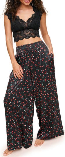 This set is made of lace, perfect for a cozy yet stylish evening. It features a lace short-sleeve crop top with lined cups and wide-leg satin pants with pockets, offering both comfort and style.