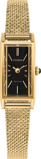 The elegance of the brand's Fio is elongated into this slim, sophisticated tank style that still boasts the style's signature cabachon-capped crown and is completed with a coordinating stainless steel mesh strap.