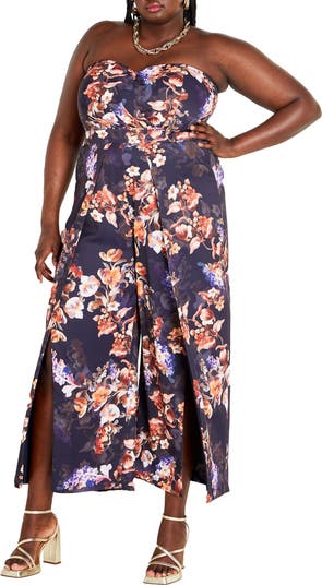 A ruffly overlay and slits below the knees add dynamic movement to a vivacious floral-print jumpsuit designed with slender, removable straps.