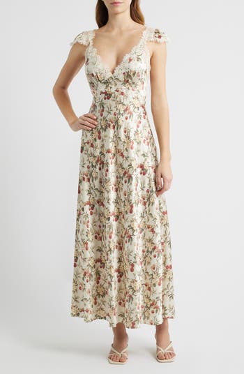 Tumbled in blooms and lilted in delicate lace, this silken maxi will be the source of romance in the room.