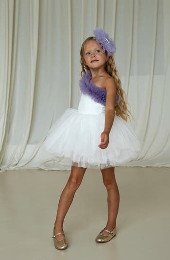 Mini Celebrities' One Shoulder tutu dress offers an eye-catching elegance with its one shoulder sleeveless design and ruffle details on the neckline.