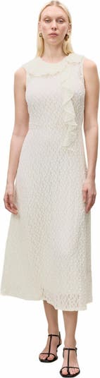 Crafted from stretch lace knit fabric sourced from Japan, this midi-length white dress features intricate detailing that exudes sophistication. A slip liner ensures comfort and coverage, while the organic cotton blend provides a soft, breathable feel. Perfect for weddings, garden parties, or elevated everyday wear, this dress offers a graceful silhouette that is both effortless and refined.