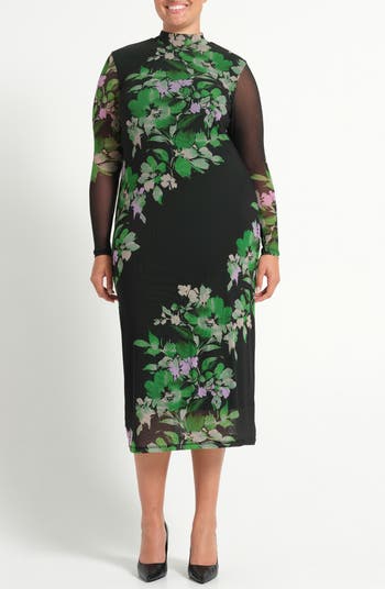 A sweeping floral pattern makes a dynamic statement on this long-sleeve mesh dress that's sure to stand out from the crowd.