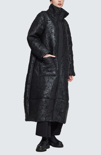 - A captivating long coat with a unique balloon silhouette, crafted from a specially coated fur fabric