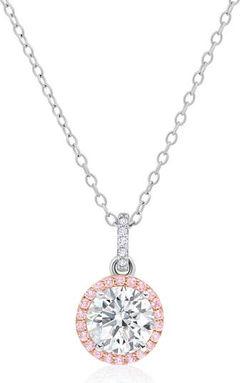 Bring rich sparkle to your evening look when you wear this striking necklace designed with a polished chain and a stunning pendant featuring a brilliant-cut cubic zirconia with a halo of hand-set pavé pink stones.