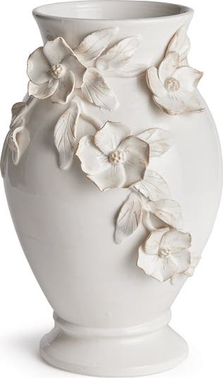 Each and every dogwood flower and leaf detail of the Fiori Vase is handmade, and hand-applied by Italian artisans in Tuscany, Italy. A seamless design in a soft white glaze and delicate antiquing along petal edges. With a classic Italian craftsmanship passed down through generations, each piece is a true original. In grand scale, a dynamic centerpiece for feature table, kitchen island or mantel.
