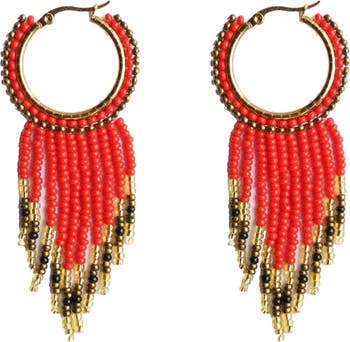 Red hot fringe hoops! The pair is perfect for adding a touch of boho luxury to your look. Stainless steel hardware for comfort and longevity.