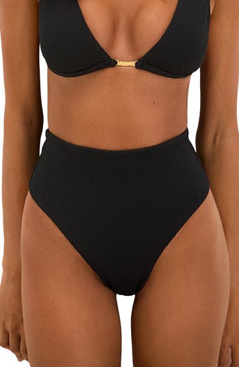 Subtle branded hardware defines the high-waist silhouette of these cheeky bikini bottoms covered in a rich texture for dimensional play.