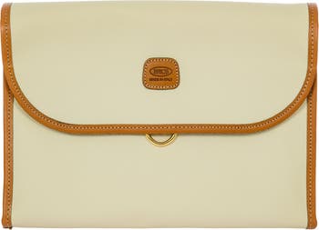 Tri-fold toiletry bag from Bric's Firenze collection, made in soft, embossed synthetic material. The iconic and elegant design is completed by the fine, vegetable tanned, Tuscan leather finishes. This overnight case ensures that all your toiletries will stay in order within an ample and organised space. EXTERIOR: two magnetic button closures; fine Tuscan leather finishes. INTERIOR: it comes with three zipped pockets and two transparent compartments; thanks to the convenient hook detail, you can also use it in an upright position.