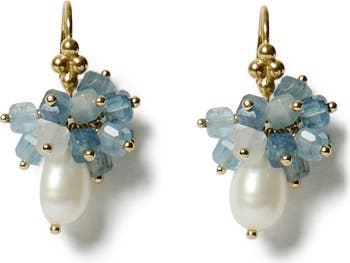 A dynamic cluster of aquamarine beads and a freshwater pearl anchor give natural beauty to these refined drop earrings crafted from sterling silver and plated in 18-karat gold.