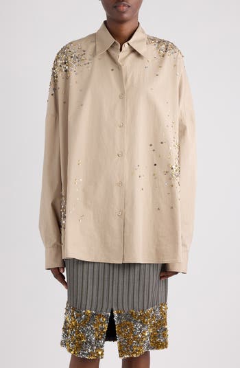 Beaded embroidery explodes into fireworks across this cotton poplin buttton-up designed in an oversized fit accentuated by dropped shoulders.