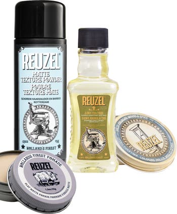 REUZEL Firm Hold & Texture Hair Try Me Kit: Bundle includes Fiber Gel, Surf Tonic Salt Spay 3.38 oz, Solid Cologne Balm, & 3-in-1 Tea Tree Shampoo 11.83oz