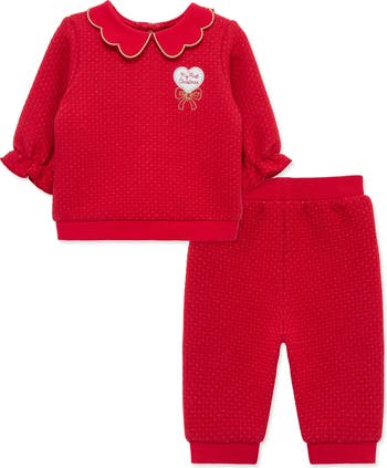 Baby will be outfitted for a comfy Santa session in this embroidered cotton-blend top featuring a scalloped collar and ruffled cuffs that's especially cute when paired with the matching joggers.