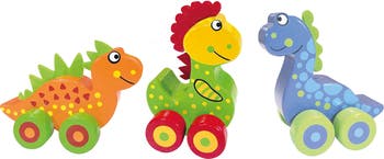- WOODEN PUSH DINOS: A beautiful set of 3 colorful dinos on wheels. Carefully crafted with the perfect size and shape for little hands to grasp and maneuver easily. Includes a green t-rex, a blue diplodocus and an orange stegosaurus. Push & play!