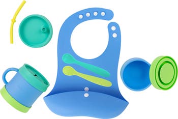 Take the stress out of mealtime with this set that includes a mug with three interchange lids that allow you to serve snacks and drinks, steam veggies, suction to surfaces, stack together and store for later. The bib rolls and snaps for spoon storage (and more), keeping your diaper bag clean and organized. Made from premium, BPA-free silicone, this durable set is safe for use in the microwave, dishwasher, freezer, and oven.