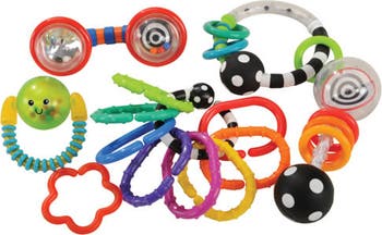 Birth & up. Help your infant teethe with ease with this exciting Infant's First Rattle and Teether Set. In addition to offering teething relief, this set promotes visual and tactile stimulation through various textures and high-contrast colors. These paint free rattles and teethers develop fine motor skills, color recognition, and sensory learning. Encourage your little one to explore the texture and features of each toy as they teethe. Contents may vary.