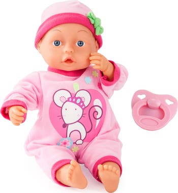 BAYER DESIGN: FIRST WORDS BABY DOLL - 13" - First Words Baby is a cute, little 33 cm / 13 inch soft-bodied doll with 24 baby sounds. Experience the joy of interactive play as you press First Words Baby's tummy, triggering a symphony of emotions. From infectious laughter to gentle cries and sweet giggles, this charming doll articulates 24 distinct baby sounds, even uttering endearing first words like "Mama", "Haha", and more. It's a delightful journey into the world of early communication and discovery. The doll wears a modern pink and white romper with cute mouse graphics and a matching cap. Due to her height, the doll can easily be taken everywhere. Delivered in a beautiful showbox including one pacifier. This baby doll is adorable and full of personality. It can help your child learn their first words. This First Words Baby Doll makes for an ideal gift that combines entertainment with educational value. Designed for children aged 18 months and over, this doll by Bayer Design has become a cherished friend, encouraging language development, and fostering a nurturing connection between child and doll. Bring the world of baby sounds, laughter, and learning to your child's playtime with the First Words Baby Doll; a charming companion full of personality and the perfect introduction to the enchanting realm of first words. Battery powered. Requires 3 LR44. (Batteries included.)