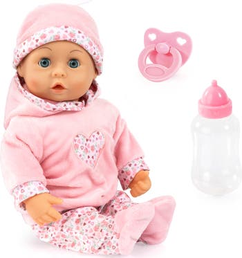 - 15" ADORABLE BABY DOLL: This 15-inch soft-bodied baby doll wears an adorable pink outfit decorated with hearts. Perfectly sized for little arms, she’s easy to hold, cuddle, and carry through every play adventure.