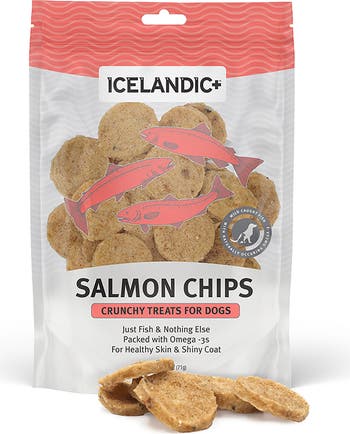 ICELANDIC+ FISH CHIPS: SALMON - 2.5OZ Keep your pup happy and healthy with our tasty Icelandic+ Salmon Chips Dog Treats. Just two ingredients - sustainably-fished salmon and wild-caught pollock. Packed with healthy fats, high protein and omega-3s, our crunchy chips are low in calories and nutrient-rich due to being air-dried using geothermal energy. Guaranteed to get your dog's tail wagging. The only ingredient is fish which is great for picky eaters and dogs with sensitivities. These snacks are rich in omega fatty acids to promote healthy skin and a shiny coat. These satisfying crunchy bite-sized chips contain no fillers, additives or preservatives. They are also grain-free, 100% natural, and made using the same process as the Vikings did in 900 AD. So, get your pet hooked on delicious, healthy Icelandic+ 100% natural, single ingredient fish treats. These treats are ideal for pets with protein sensitivities. All of our fish treats are sourced daily from the pure waters of Iceland, and then immediately cleaned, air-dried, and processed. These crunchy snacks promote healthy gums and teeth by reducing tartar and plaque build-up, while also providing Omega-3 fatty acids to help improve your pet’s healthy skin and coat. Icelandic+ fish treats are the treat that will have your pet wagging for more.