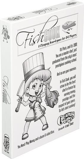 FISH COOK - It’s Paris, and it’s 1909. You are a master chef, just graduated from the city’s most prestigious cooking school. And so are your enemies. Fish Cook is a board game about cooking fish. Players vie to become the best chefs in France by earning money, prestige, and the respect of their peers. (And since it’s a board game, prestige and respect are conveniently measured in money.) Earn the most money, and you will be declared the Master Chef! Fish Cook is a simple Euro-style board game in which players take the role of chefs. The game is divided into several "days" that have two parts: Morning and Evening. In the morning, players buy ingredients from the fish market and farmer's market; in the evening, they cook recipes and earn money. The strategy revolves around buying ingredients as cheaply and efficiently as possible, in addition to stealing the good ideas of your fellow chefs. OVERVIEW: For Ages 12+. 2-6 Players. 45 Min Playing Time. Luck and Skill game! A GENTLE REMINDER: Cheapass Games in the black and white box do not always contain all of their parts. To complete your copy of Fish cook, you will need some play money (about $250 per player including 1's) and a dozen 6-sided Dice.
