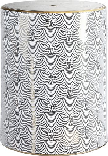 A black-on-white line drawing in a fish-scale pattern gives this chic little garden stool a modern, artistic touch. The ceramic cylinder is a stylish update to the small drinks table. Gold edging and a glossy finish add a touch of glamour.