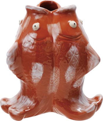 - A delightful stoneware fish vase with a reactive glaze finish in vibrant orange and white tones