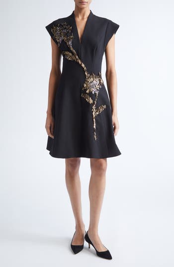 Crafted in the brand's signature stretch twill, this dynamic fit-and-flare cocktail dress shaped with a high collar is embellished with metallic fishing lures. These golden spinners are used on the fishing line to catch the light and to entrance, and their application here as a botanical embroidery element does just that.