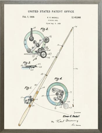 This vintage-inspired print, framed in a black wooden frame, features a fishing reel patent. Sized at 16 inches by 20 inches, this made in the USA frame makes for a beautiful addition to any wall.