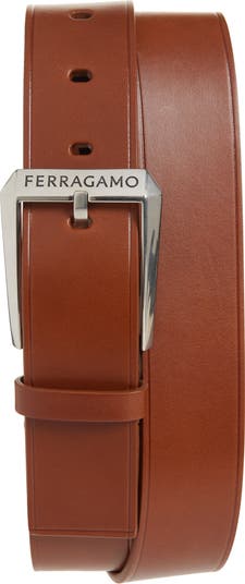 A brand-engraved, art deco–style polished buckle gleams as the only contrast on this belt crafted from smooth calfskin leather.