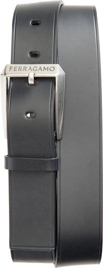 A brand-engraved, art deco–style polished buckle gleams as the only contrast on this belt crafted from smooth calfskin leather.