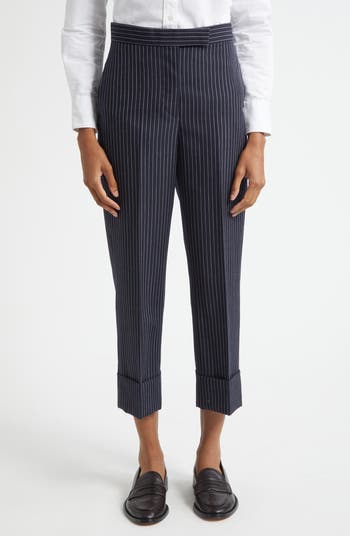 Superfine virgin wool and sharp pinstripes deliver a classic yet contemporary edge to cuffed pants designed with a back button strap and gliding cupro lining.