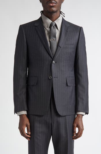Tricolor trim at the cuffs and nape put Thom Browne's signature stamp on a sport coat tailored of pinstriped wool gabardine in the label's iconic shrunken fit.