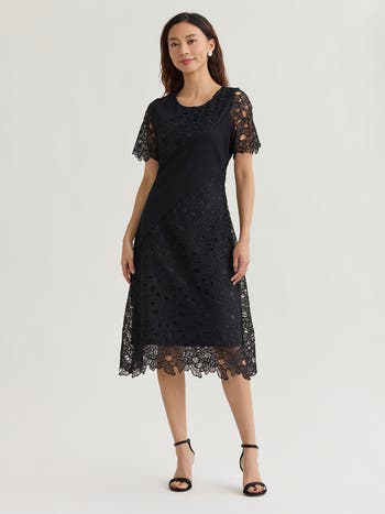 This stunning midi dress features an asymmetrical blend of smooth fabric and intricate lace for a modern take on classic evening wear. The delicate lace sleeves and laced scalloped hemline provide a romantic touch, making it a perfect choice for spring weddings or formal celebrations.