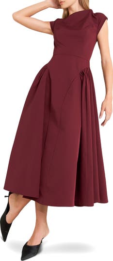 Shirred sides create a flared skirt that brings movement to this pocketed fit-and-flare midi dress that's framed by abbreviated cap sleeves.